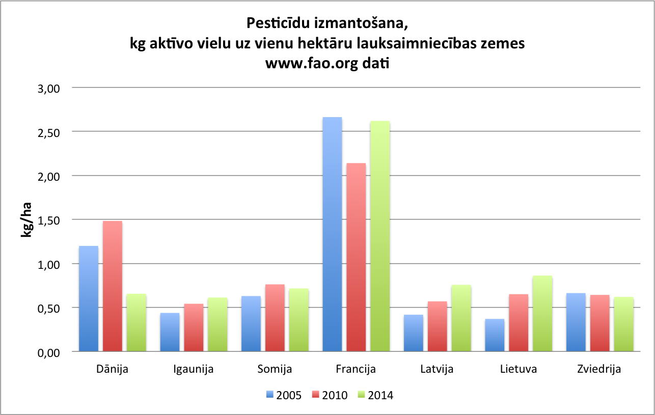 Mēs gan izmantojam ievērojami mazāk pesticīdu kā Itālija vai Francija, tomēr – tendence ir augoša, un nupat mēs pesticīdu izmantošanā apsteidzam Igauniju, Dāniju, Zviedriju un Somiju. Kamēr citās valstīs pesticīdu izmantošana ir stabila vai krīt, pie mums – strauji aug. Nu jau citas valstis mūs arī apsteidz bioloģisko sertificēto lauksaimniecības platību ziņā (rēķinot pret kopējo platību) – visās valstīs šīs platības pieaug, bet pie mums mazāk strauji kā citur.